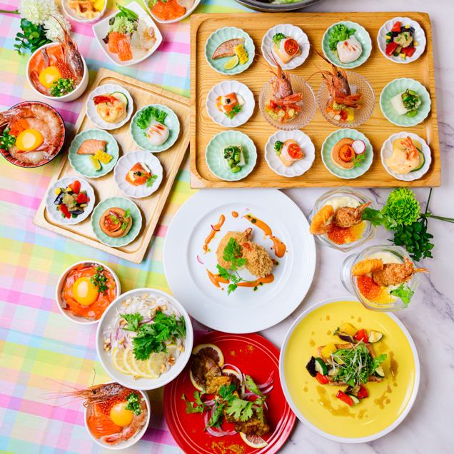 1日5組限定!コスパはもちろん、見た目にも鮮やかな豪華なラインナップです!メイン料理をお選びいただけます!シェフの逸品タル沼ジャンボエビフライ、サーモン&エビ盛り合わせに始まり、お刺身、丼、揚げ物、デザートまで食べ放題!甘エビ・生サーモンは市場直送で鮮度も申し分なしです!